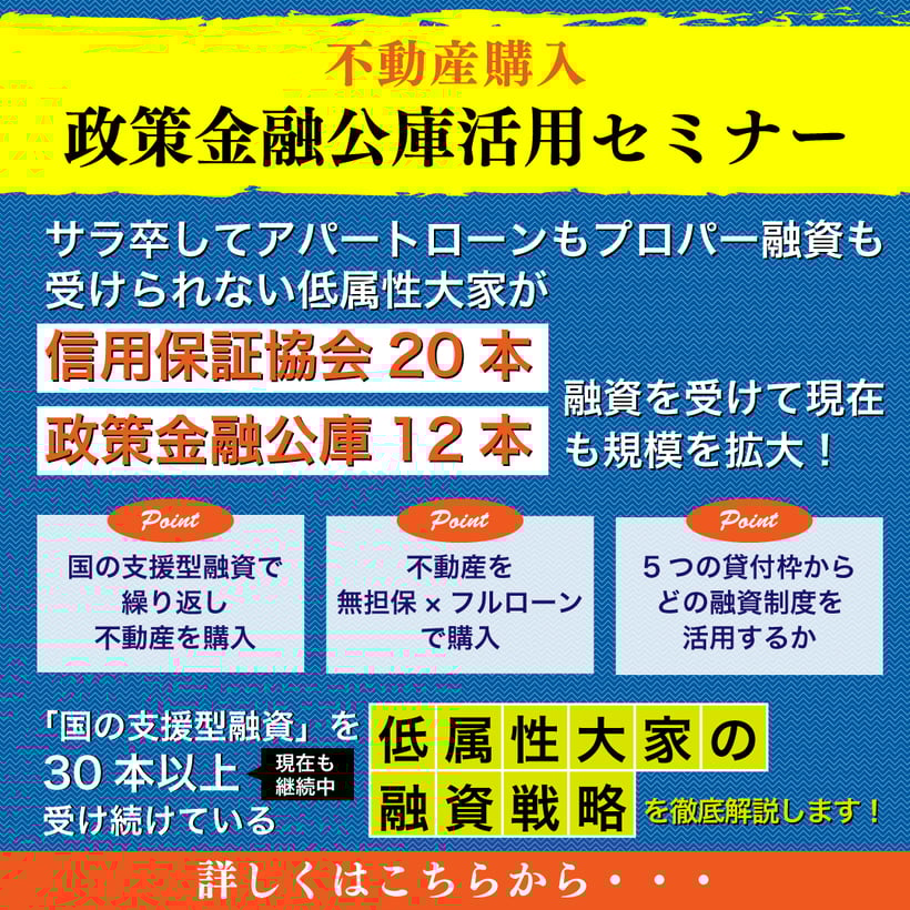 このページでは、不動産賃貸業(プロパー融資がまだ引けない小規模大家さん)のために物件購入資金である『政策金融公庫や信用保証協会』の設備資金融資に特化して説明する2時間半のセミナー『信用保証協会から20本融資を受けて分かったこと』への参加登録方法をご案内するページです。