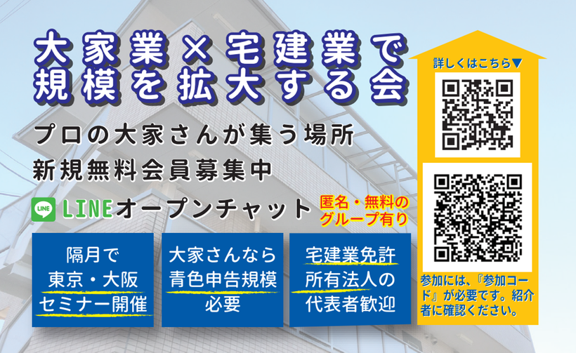 規模が上記以上の方であれば、宅建業を取得する予定がなくても、宅建業者ノウハウを習得したいという方の参加を歓迎しています。宅建業を既に取得してこれから大家業に取り組む方も大歓迎です。